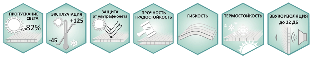 - Звукоизоляция: сотовый поликарбонат обладает значительной звукоизоляцией за счет структурного ячеистого строения листа. Поглощение звука увеличивается с увеличением толщины листа;